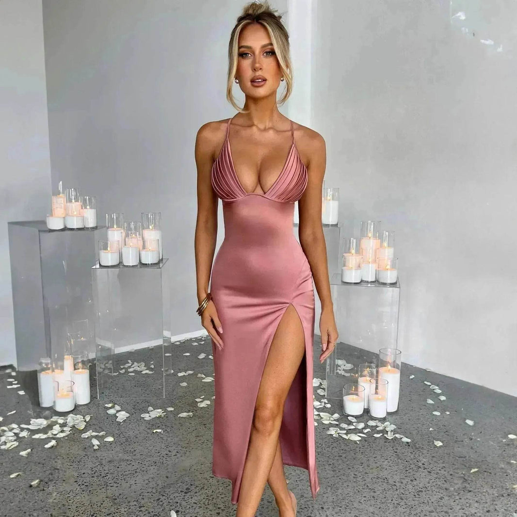 فستان حزام السباغيتي مع تصميم مقسمة عميق الخامس على عجز البودكون ساتان الساتان ساتين حفل زفاف كوكتيل الزفاف للنساء الملابس