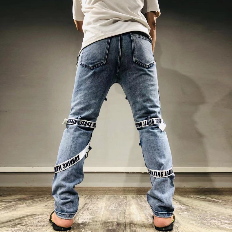 بمشاركة تصميم جينز متقطع مع أحزمة رسومية وتفاصيل مرقعةهذه الجينز تقدم جمالية حضرية قاسية تبرز في المكان. القصة الضيقة توفر ظلا عصريا يكمل الأحذية الرياضية أو الأحذية أو أزياء الشارع.