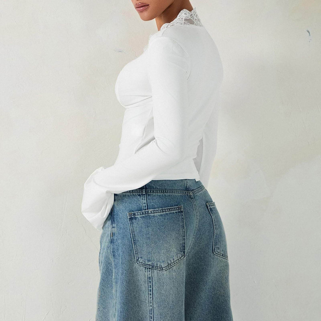 Slim V-neck Lace Button Shirt tank top Ins Fashion Trumpet Sleeve Long-sleeved Top Women Clothing