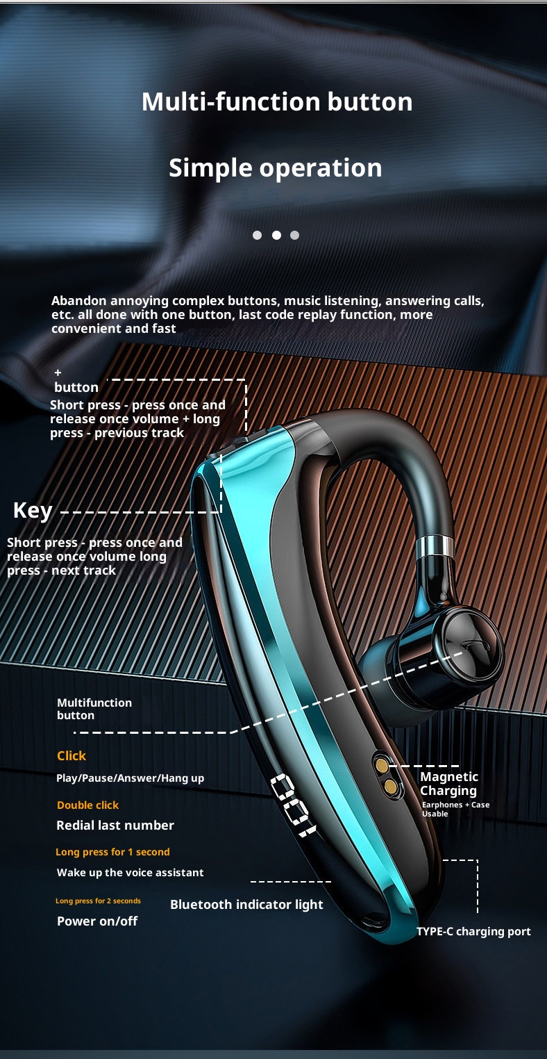 Functions: Waterproof, noise reduction, bone conduction, breathing light, super long service life battery, call function, voice control, support music, digital display