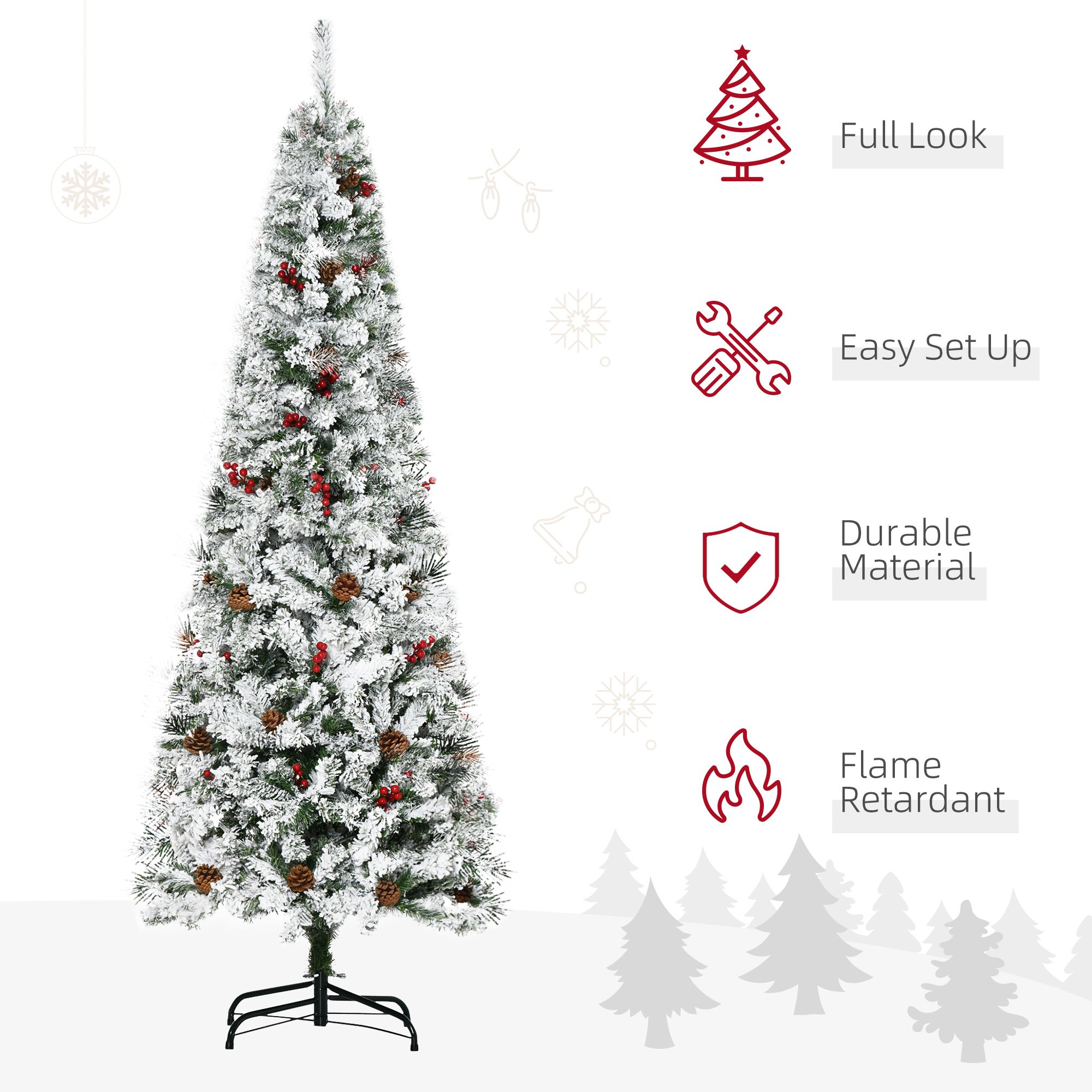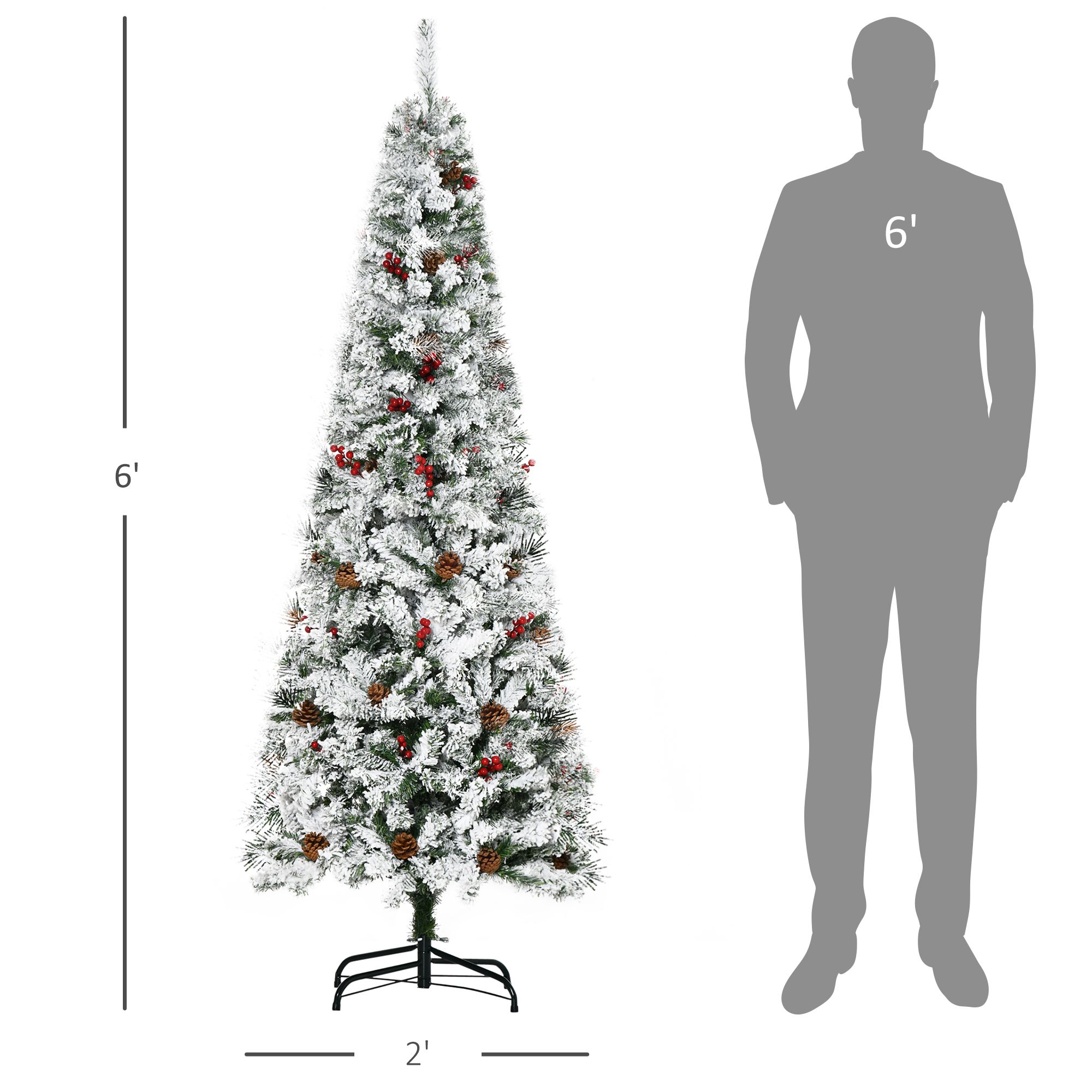 6 Foot Pencil Snow Flocked Artificial Christmas Tree With 600 Pine Realistic Branches, Pine Cones, Red Berries, Auto Open, Green