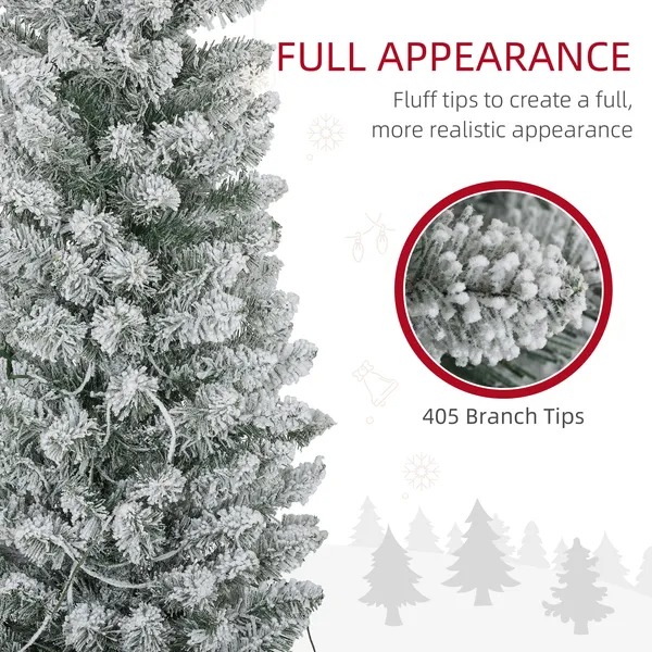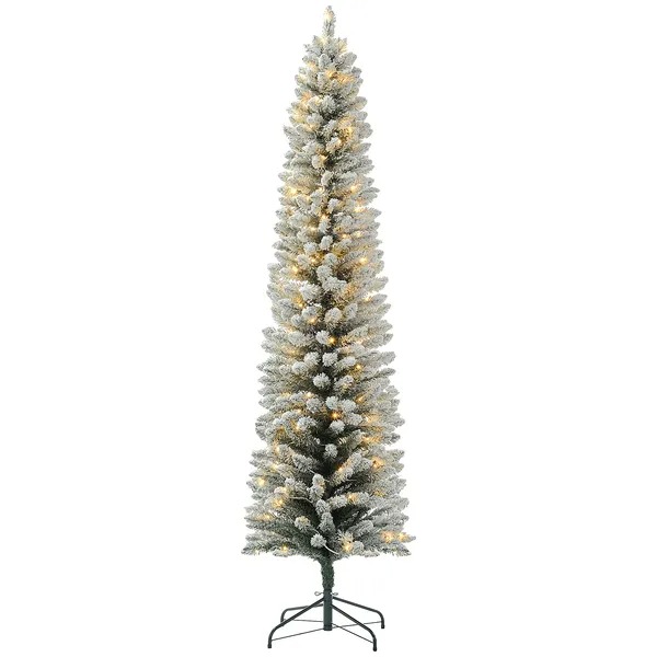 7ft Artificial Prelit Christmas Tree With Warm White LED Light, Snow Flocked Branches, Metal Base, Pencil Xmas Tree