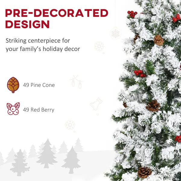 9-foot Pencil Snow Flocked Artificial Christmas Tree With 1350 Pine Realistic Branches, Pine Cones, Red Berries, Auto Open, Green