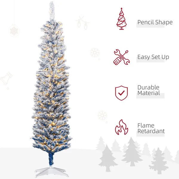6' Flocked Christmas Trees, Pencil Prelit Artificial Christmas Tree With Snow Branches, Blue