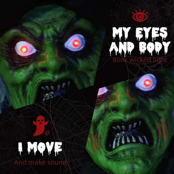 - Outdoor Halloween Animatronics: As soon as detects the arrival of trick-or-treaters, it moves, stares into their souls with ghastly red glowing light and makes a creepy sound.
